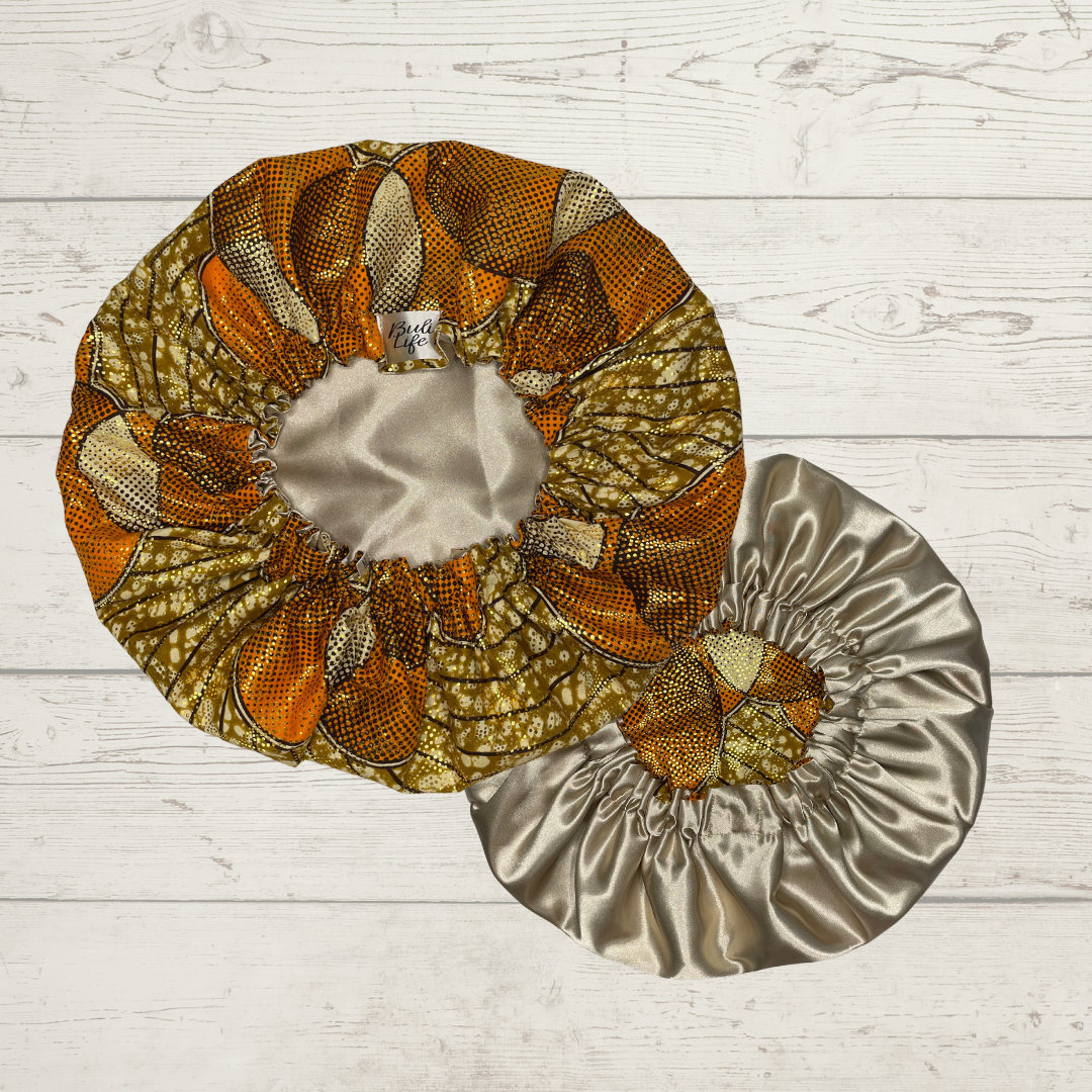 **Satin lined bonnet that can be worn on either side (although it is recommended to wear the satin on the inside)! Keeps hair from drying, frizzing, and breaking while also holding in moisture while you sleep 💕!
